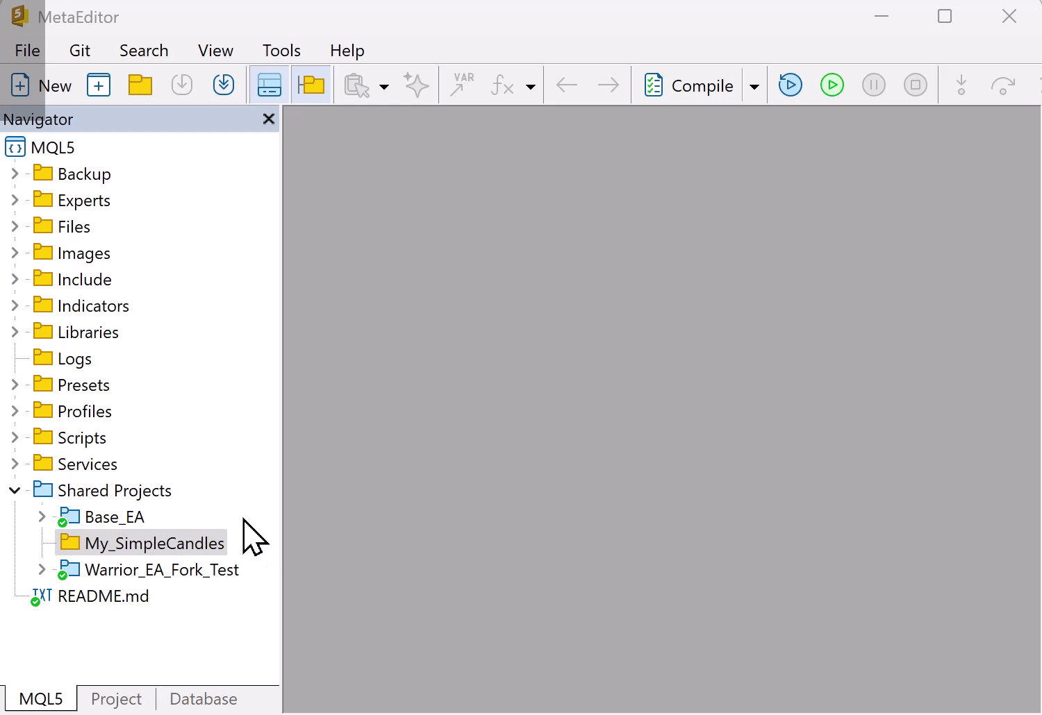 在 MetaEditor 中,使用相同的 MQL5 帐户,在导航器中运行刷新命令。您的分支将出现在 Shared Projects 文件夹中。使用 Git Clone从 Algo Forge 下载它。您不仅会收到项目文件,还会收到其完整的提交历史记录和所有分支。这意味着您可以继续进行分支工作,同时仍然拥有克隆项目的整个历史。